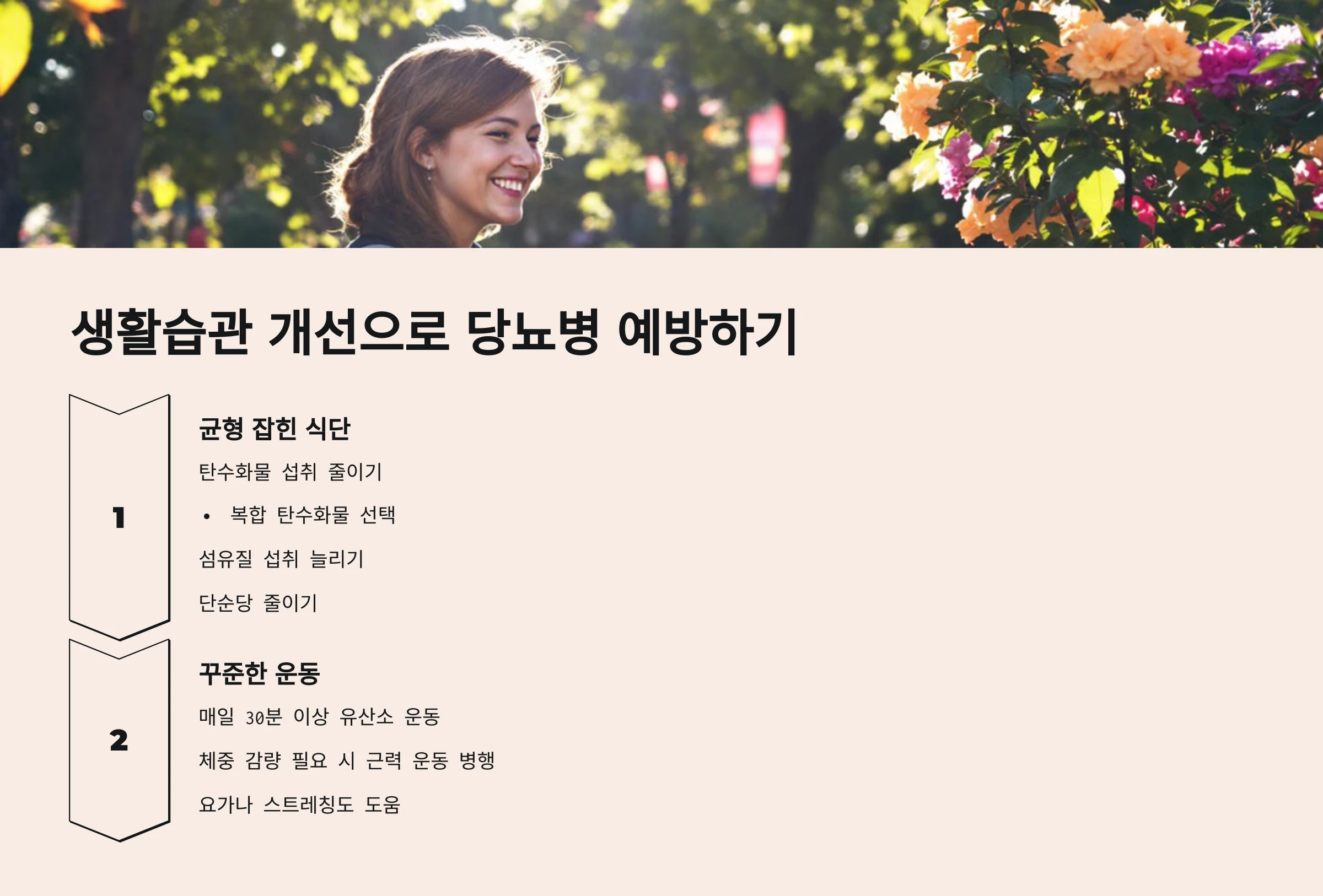 운동은 혈당을 낮추고 인슐린 민감성을 높여 당뇨 예방에 도움을 줍니다.