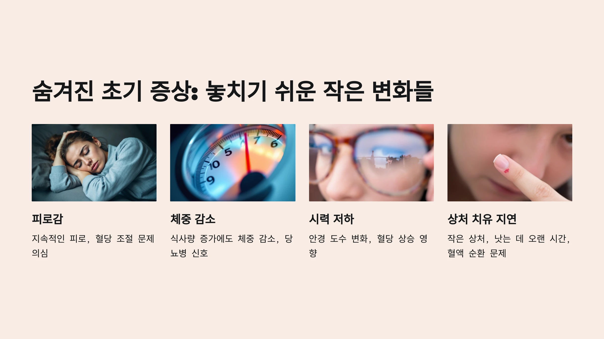 이 외에도 손발의 저림, 감각 둔화, 잦은 감염 등이 초기에 나타날 수 있으니 평소와 다른 변화가 있으면 점검하세요.